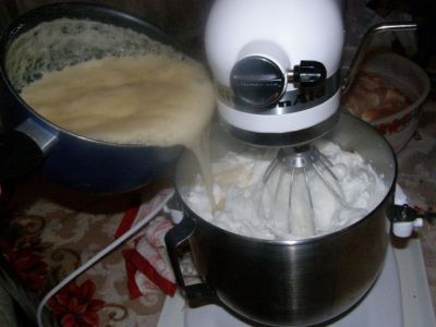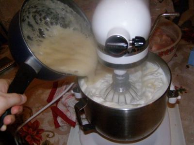 И тогда вливаем маленькой струей, горячее джело в миксер на большой скорости взбивая ещё 1- 2 минуты