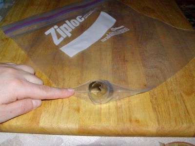 Тогда берём мешочек с зипером, то есть тот что закрывается на молнию, внизу одного угла срезаем ножницами маленький конец и заставляем в этот угол насадку 18 мм с узором, я не рекомендую брать маленькую насадку так как будет очень тяжело и практически не возможно выдавливать из неё