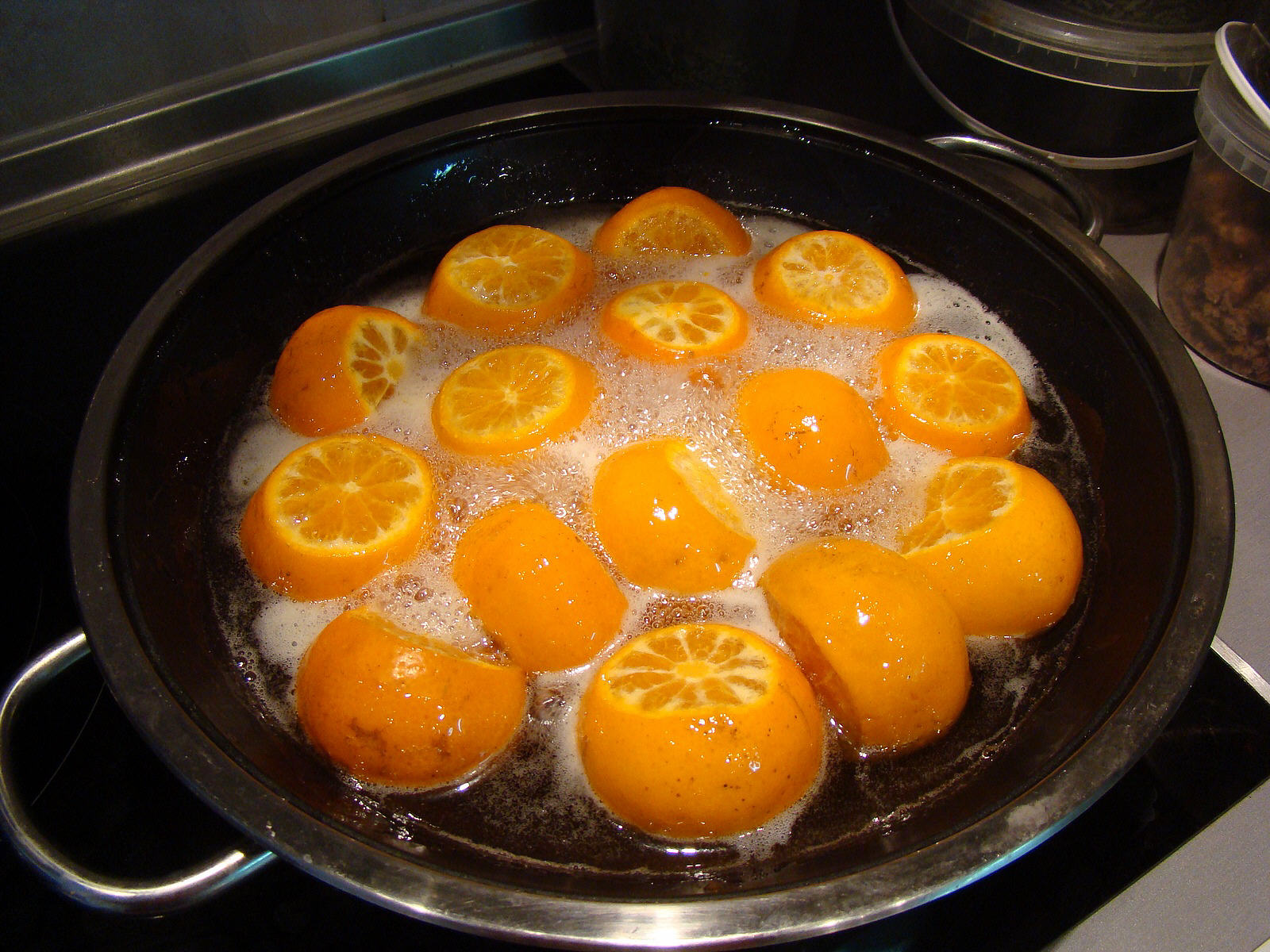 Отдельно в кастрюле закипятить воду, проколоть мандарины вилкой и опустить в кипяток на несколько минут. Это удалит с плодов излишнюю горечь. Достать мандарины и снова разложить на сухом полотенце.