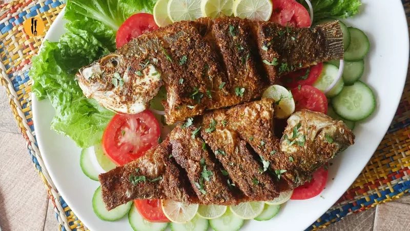 Сервировать филе тилапии в индийском стиле на рисе, а сверху уложить салат из моркови и огурца.