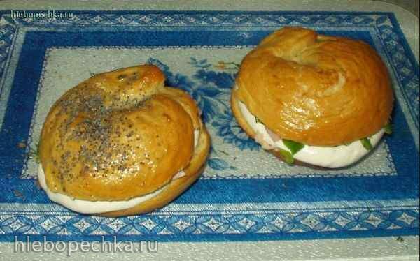 Вскипятить воду в большой кастрюле, добавить 25 г. сахарной пудры. Варить каждый багель по 1 минуте, поворачивая шумовкой. Вынуть, стряхнуть воду, уложить на противень. Смазать взбитым с ложкой вожы желтком. Можно посыпать маком или кунжутом.