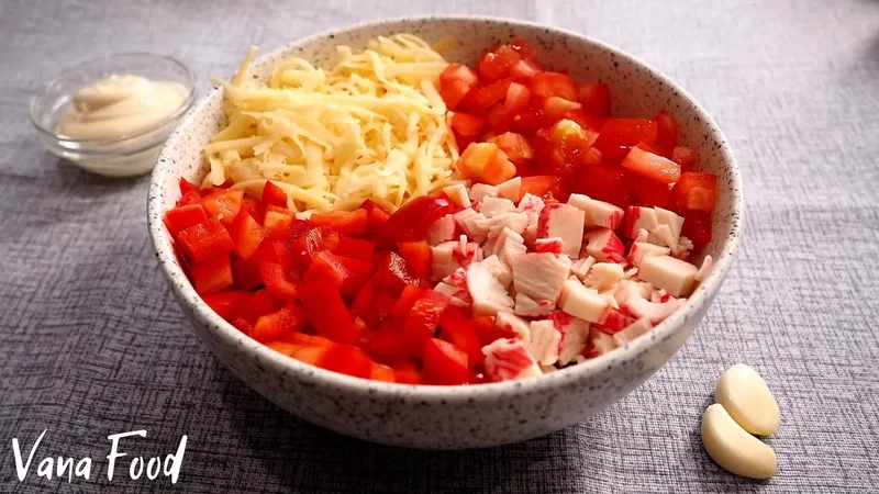 крабовые палочки 200 гтоматы 200 гкрасный болгарский перец 200 гсыр 150 гчеснок 2 шт. майонез 2 ст. л.