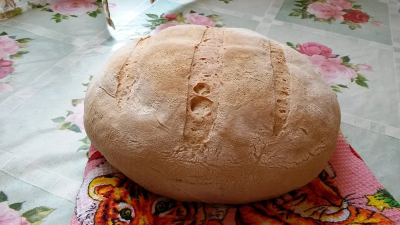 Видите, Чучелка, что на поверхности есть вмятины? Это я нажала ненароком на тесто после расстойки, а после выпечки эти вмятины так и не расправились. И разрезы пока у меня не получается делать.