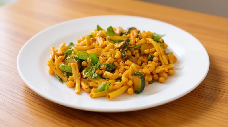Разогрейте сковороду с 2 ст. л. растительного или оливкового масла, добавьте кубики цукини и обжарьте на среднем огне до золотистого цвета. Добавьте нарезанный перец, перемешайте, добавьте нут и панировочные сухари, при необходимости добавьте оставшееся количество масла, приправьте пряностями и солью. Готовьте ещё несколько минут и подавайте к столу украсив свежей зеленью по вкусу.