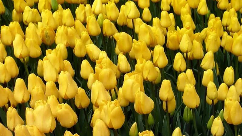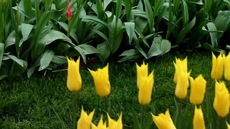 Один вопрос мне не дает покоя: на каком расстояние они сажают луковицы, что они стоят как столбики и поддерживают друг друга, не давая листьям распадаться?Эля, тюльпаны высажены довольно густо, но не забывайте, что садятся они не луковицами, а рассадой иногда с уже раскрывшимися бутонами. По другому никогда не получить таких ровных всходов.