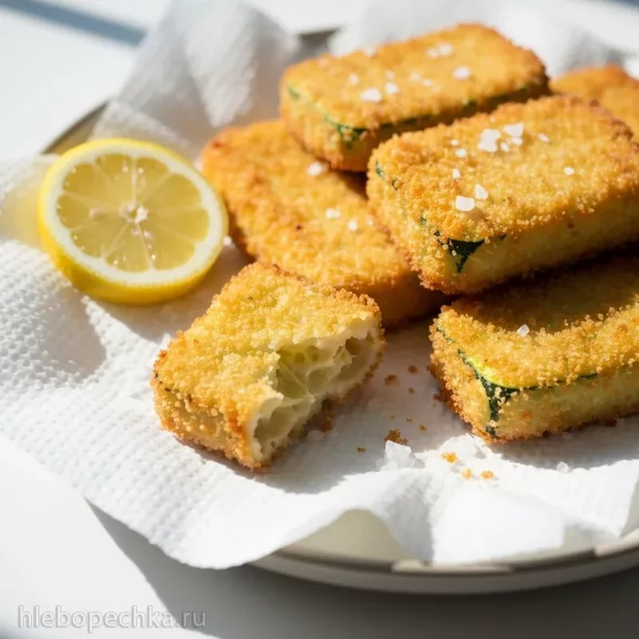 Процесс панировки состоит из трех этапов. Сначала обваляйте брусочки в муке, смешанной с солью, перцем и паприкой. Затем окуните их во взбитые яйца. Наконец, покройте их хлебными крошками панко, плотно прижимая панировку. Именно панко обеспечивают особенно легкую и хрустящую корочку. Жарьте кабачки на среднем огне в хорошо разогретом оливковом масле до появления легкой ряби на его поверхности. Готовьте партиями, в один слой, не перегружая сковороду. Обжаривайте по 2-3,5 минуты с каждой стороны, переворачивая 2-3 раза. Готовые кабачки выкладывайте на бумажные полотенца, чтобы убрать излишки масла. Подавайте немедленно, с дольками лимона и щепоткой крупной морской соли.