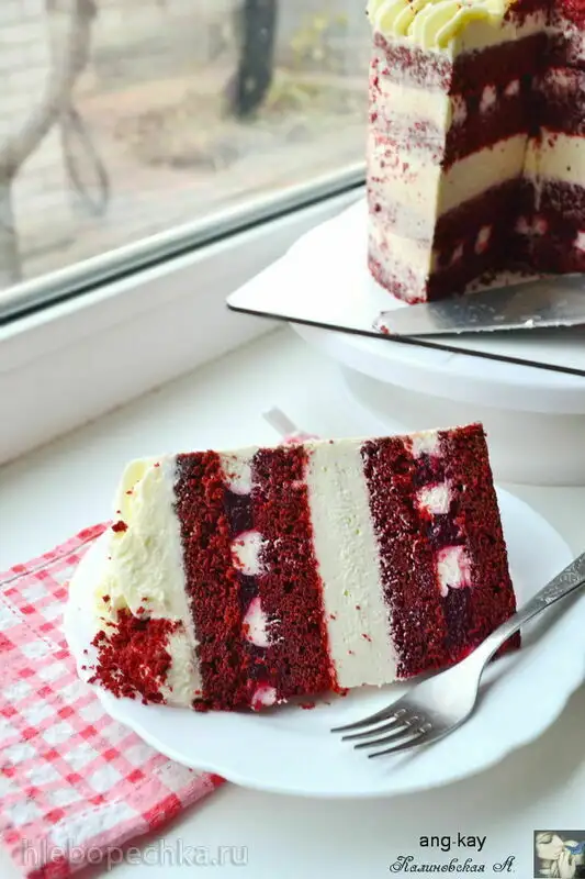 Торт достать, снять кольцо и пленку. Декорировать на свой вкус. Я торт оставила "голым". Сверху крем-чиз на масле.