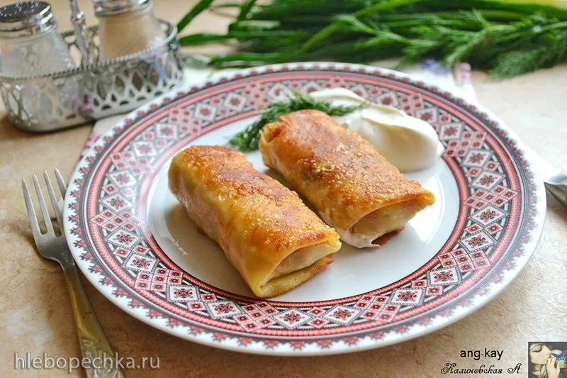 На каждый блинчик выложить немного начинки. Подвернуть края и свернуть.