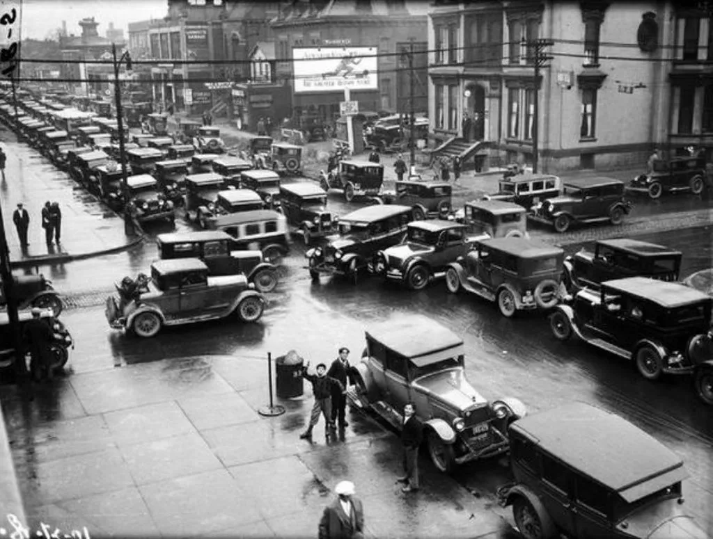 Автомобильная пробка на перекрестке в Детройте. США. 1928 г.