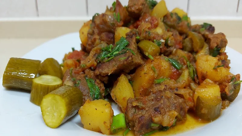 Обжариваем лук, добавляем морковь, потом томатную пасту хорошо обжариваем, потом помидоры и в конце огурцы. Потом добавляем мясо, солим, перчим, кстати соли положите поменьше, еще из огурцов соль будет. Добавляем немного воды, пробуем, можно добавить чуть сахара.