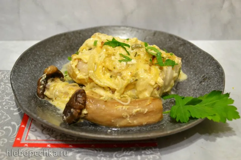 Вкусная и нежная рыба. Сверху рыбу полить образовавшимся сливочным соусом и украсить грибами и зеленью.