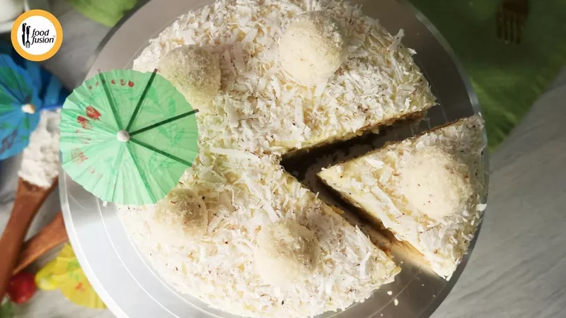 Готовый торт освободить от формы и ацетатной ленты. Обмазать ранее оставленным кремом обсыпать мелкой кокосовой стружкой. Украсить по своему желанию.