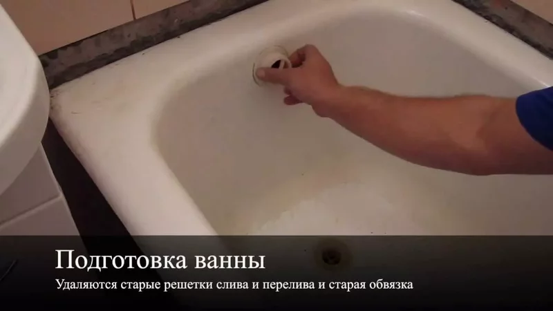 Слив и перелив нужно демонтировать и с помощью шлифовки зачистить стенки и дно ванны до получения однородного матового покрытия без трещин и потеков.