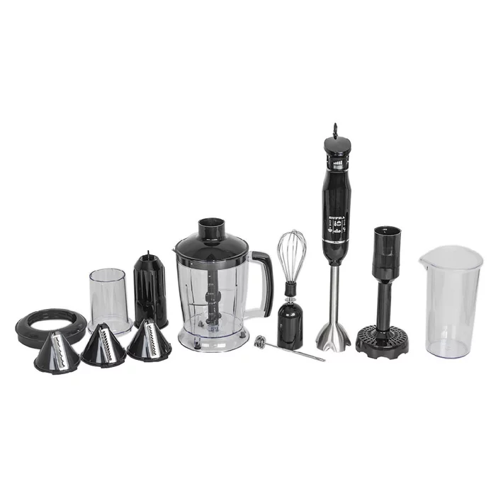 | Комплектация | блендер, съемная насадка-блендер из нержавеющей стали, съемная насадка-венчик из нержавеющей стали, венчик для взбивания молочной пенки, измельчитель с конусными насадками 1,25 л., насадка для картофельного пюре, мерный стакан с крышкой 600 мл., инструкция на русском языке, гарантийный талон |