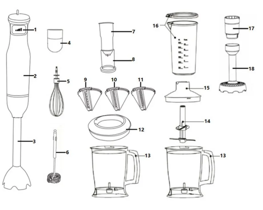 - Во время взбивания продуктов или измельчения держите волосы, руки, одежду, а также кухонные приборы подальше от работающего прибора, чтобы избежать травмы.