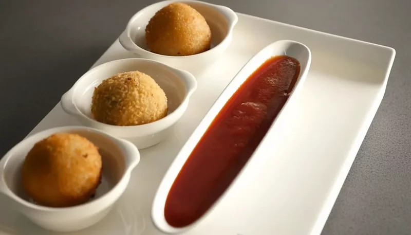 - Подавайте картофельные шарики горячими, полив их приготовленным соусом.