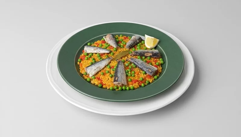 - Примерно через 9-10 минут, когда вы увидите, что большая часть бульона впиталась в рис, уменьшите огонь до средне-слабого. Выложите на рис замороженный горошек. Для эстетического удовольствия выложите консервированные сардины по кругу.