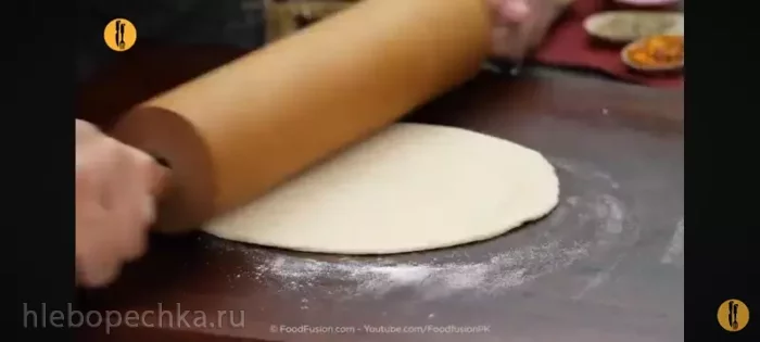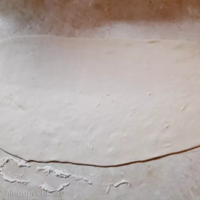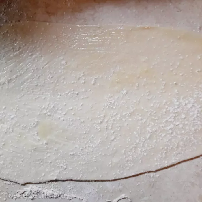 Раскатываем тесто в круг, смазываем поверхность растопленным маслом и присыпаем мукой.