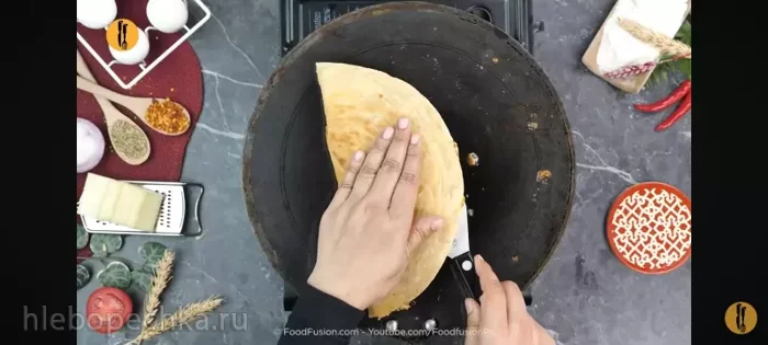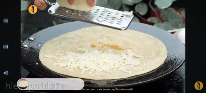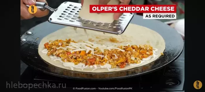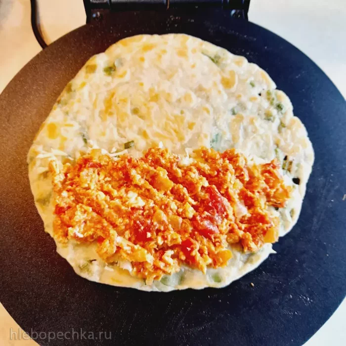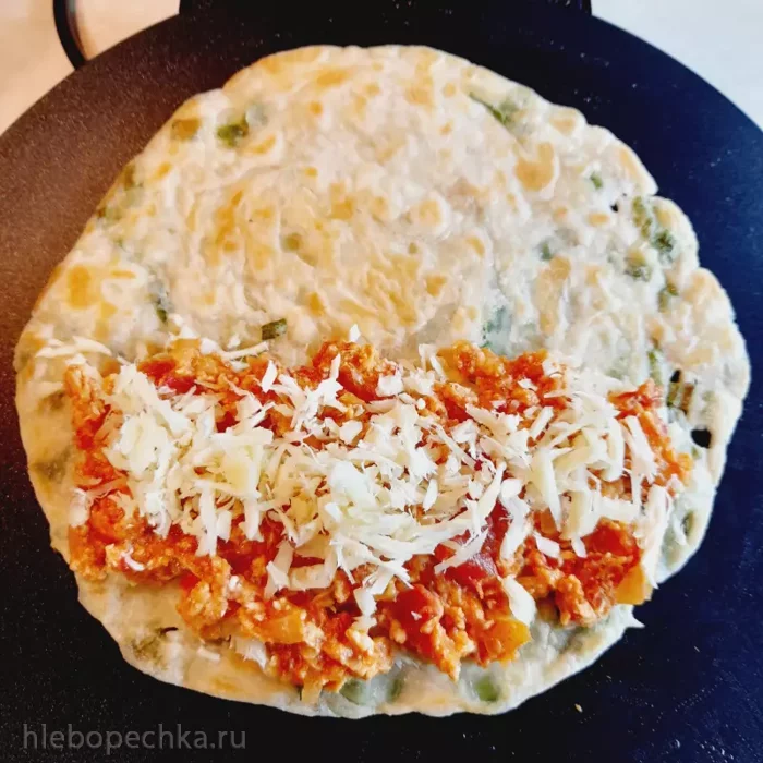На чуть меньше половины поверхности лепешки выкладываем натертый сыр, обжаренную томатно-луково-яичную смесь. Сверху на смесь натираем сыр.