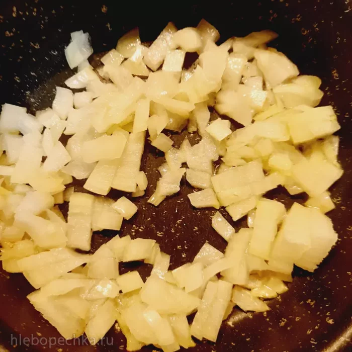 Разогреваем масло на сковороде, добавляем мелко порезанный лук.