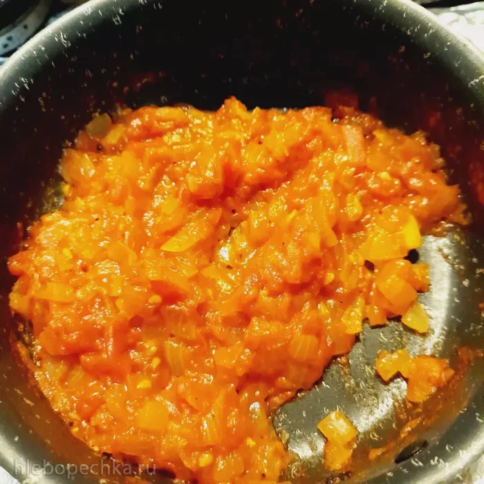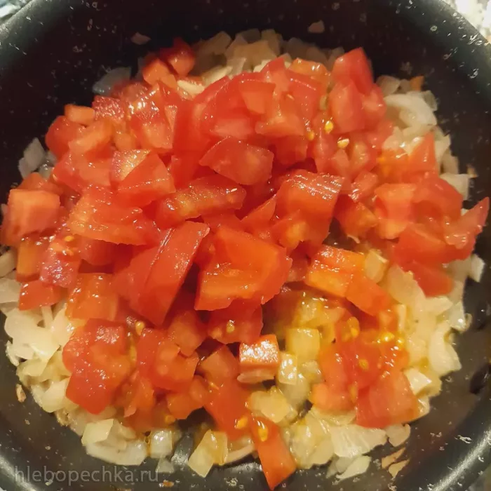С помидора удалила шкурку, порезала мелким кубиком и добавила в сковородку к луку.