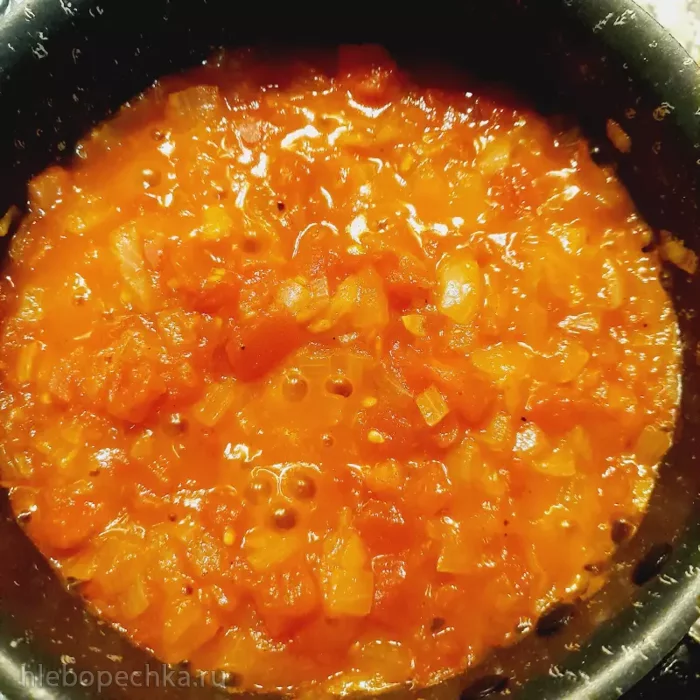 Добавила соль, специи (перец черный, перец чили, уцхо сунели, копченую паприку, уляпскую аджику). Томила всё вместе до выпаривания жидкости.