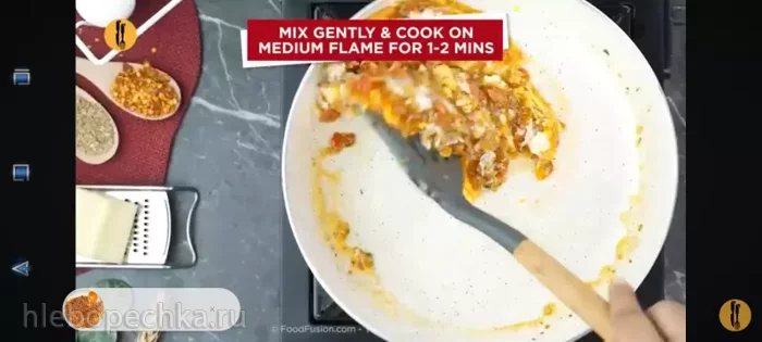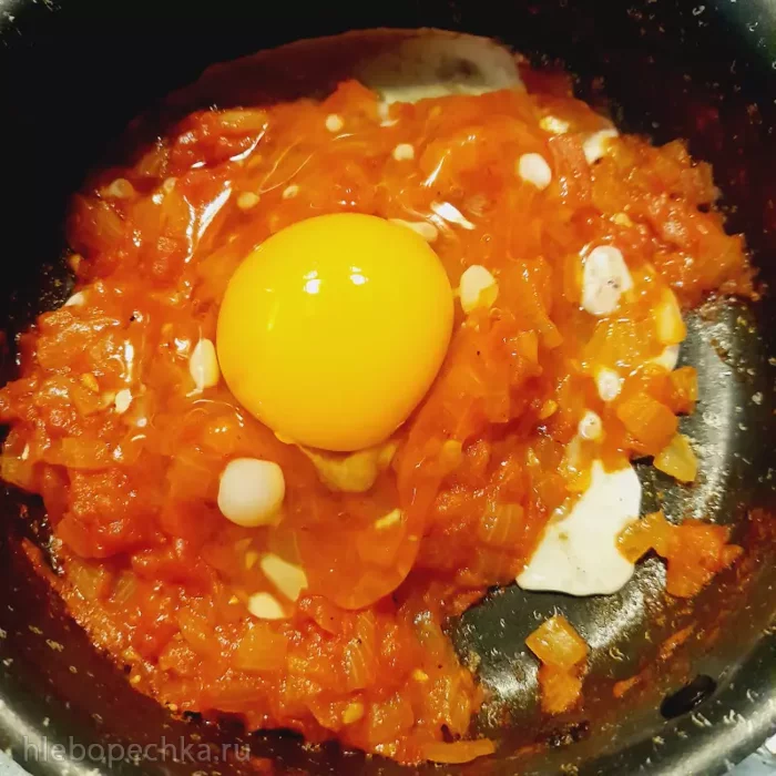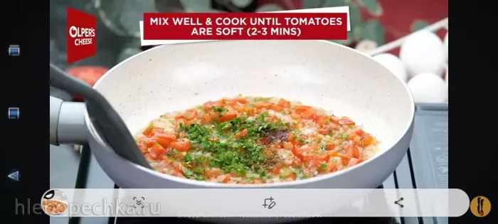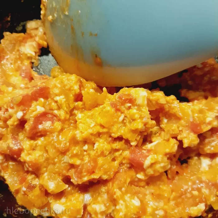 Разбиваем в луково-томатную смесь 2 яйца, размешиваем всё вместе и прожариваем 1-2 минуты.