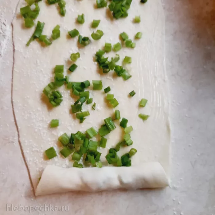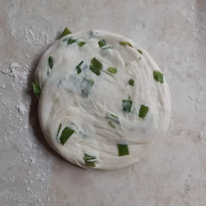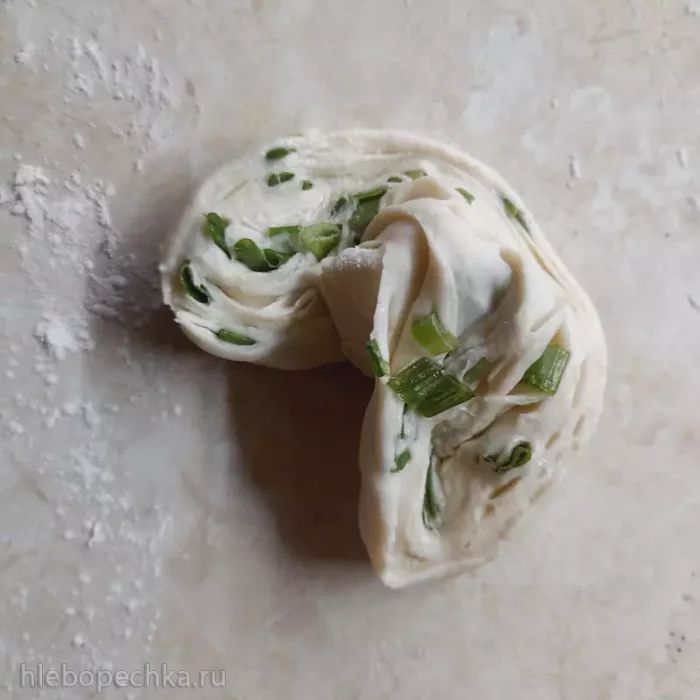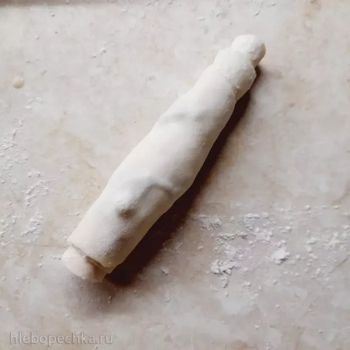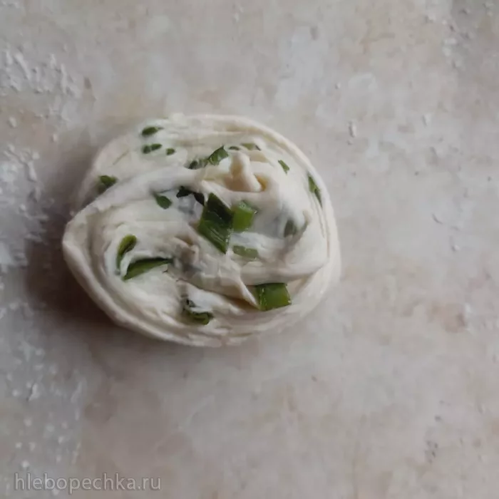 После каждый моток присыпаем мукой, сдавливаем ладонью и раскатываем в тонкий блинчик.