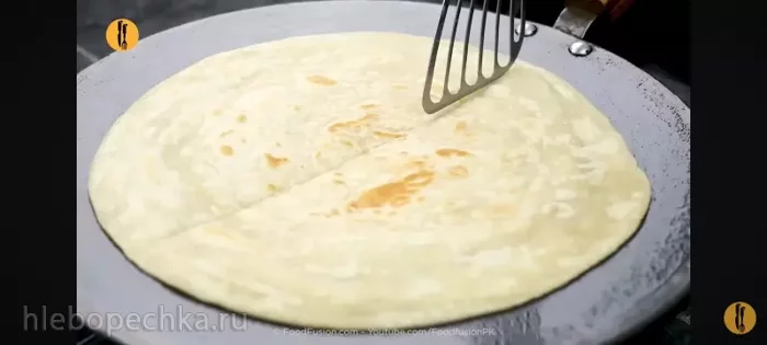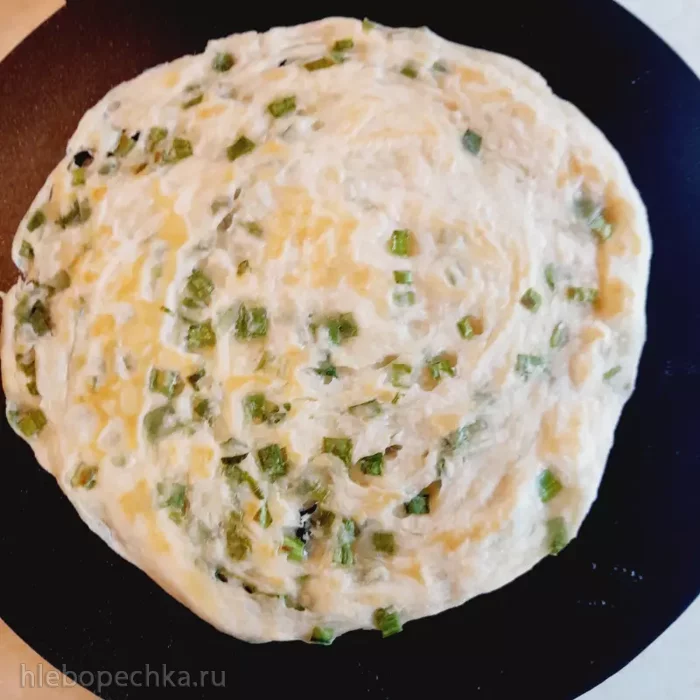 Перевернула лепешку, смазала поверхность лепешки растопленным маслом. Подождала, пока нижняя поверхность поджарится, перевернула.