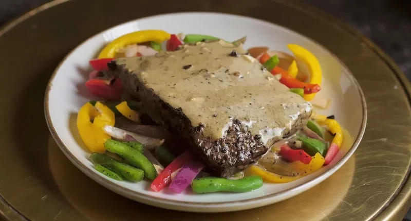 - На разогретой сковороде растопите 1 чайную ложку сливочного масла. Добавьте обжаренные овощи, готовые говяжьи стейки и готовый перцовый соус. Подавайте горячим и наслаждайтесь!
