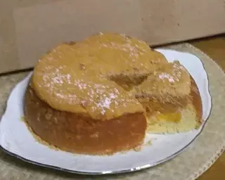 шарлотка-перевертыш с яблоками и персиками. Кому? Горяченькая, налетай!Похоже, что уже всё съели.