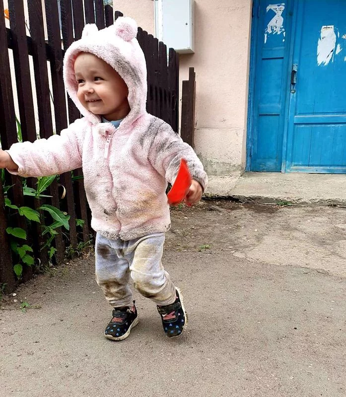 А это наша атаманша, вчера утром пока мать собирала малину Варвара вот так развлекала себя. И в песке и в грядках поиграла и себя украсила.