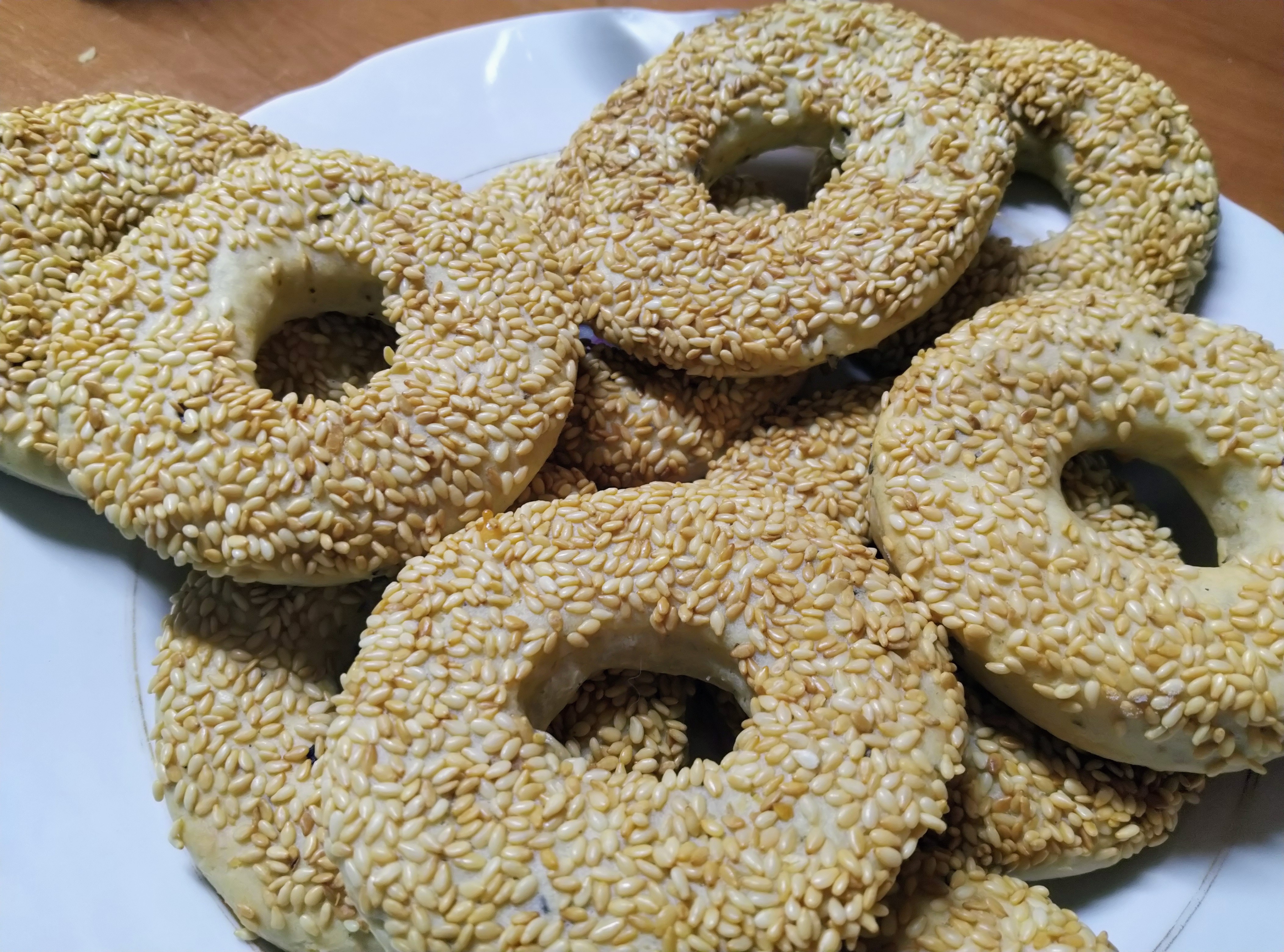 Каждый бублик смазать молоком при помощи кисточки и положить мокрой стороной в насыпанный в тарелку кунжут. Выложить на застеленный противень. Отправить в разогретую до 180°C духовку (конвекцию лучше не включать, чтобы не нарушить кунжутный слой, нагрев только верх-низ) примерно на 20 минут или до готовности, но они не должны быть бледными.