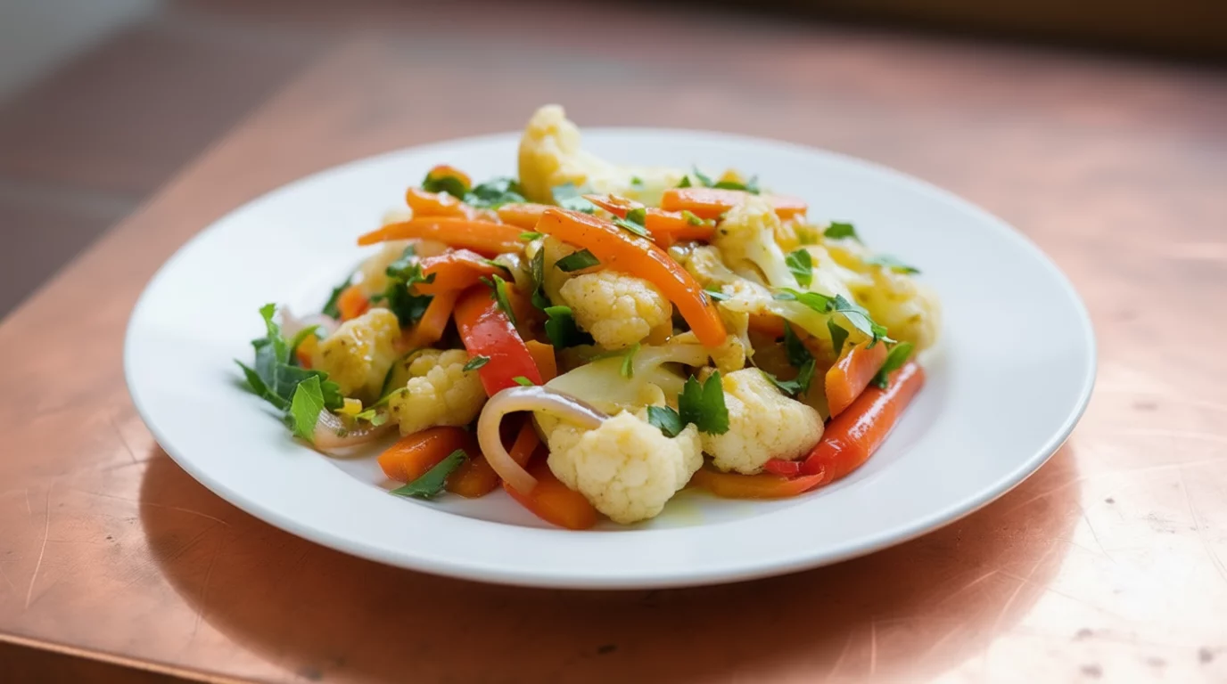 - Добавляю бланшированную цветную капусту, паприку и кайенский перец. Обжариваю еще 2–3 минуты на огне от среднего до среднего-сильного. Я снимаю сковороду с огня и перекладываю овощи в большую миску.