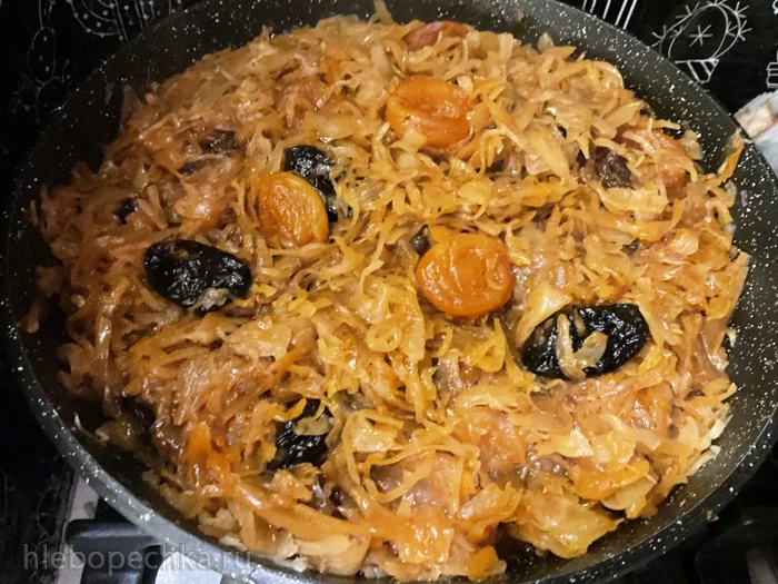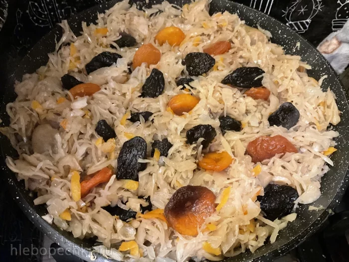 Подлить кипяченой воды, добавить специи, накрыть крышкой и тушить полчаса на самом маленьком нагреве. Иногда перемешивать. В процессе добавить сухофрукты.