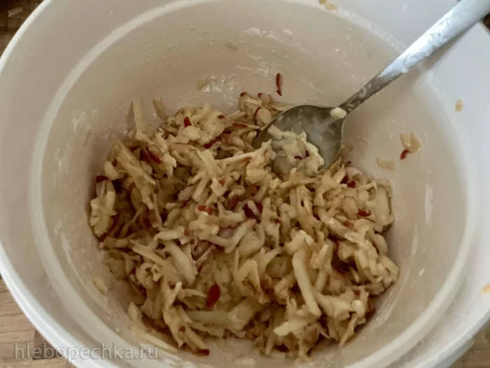 Яблоки натираем на крупной терке, добавляем ванильный сахар и две ложки столовые без верха крахмала.