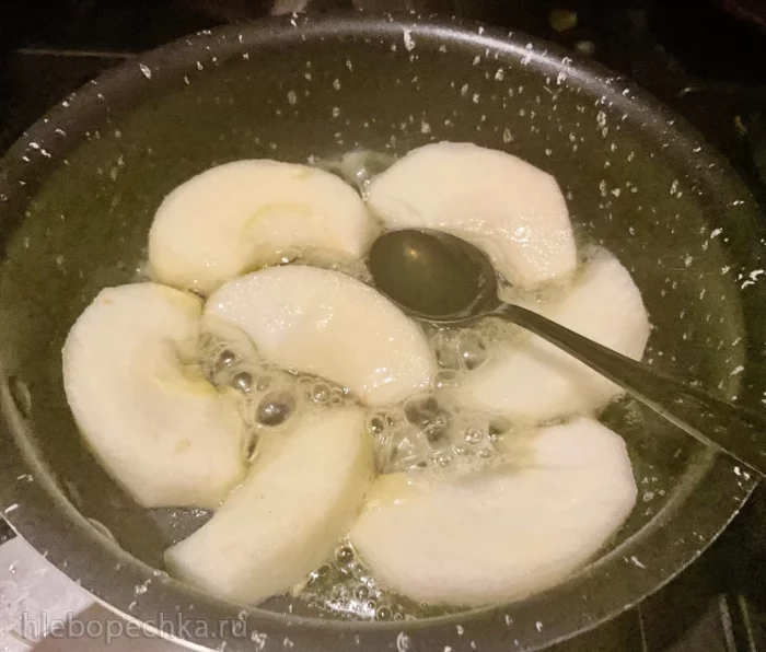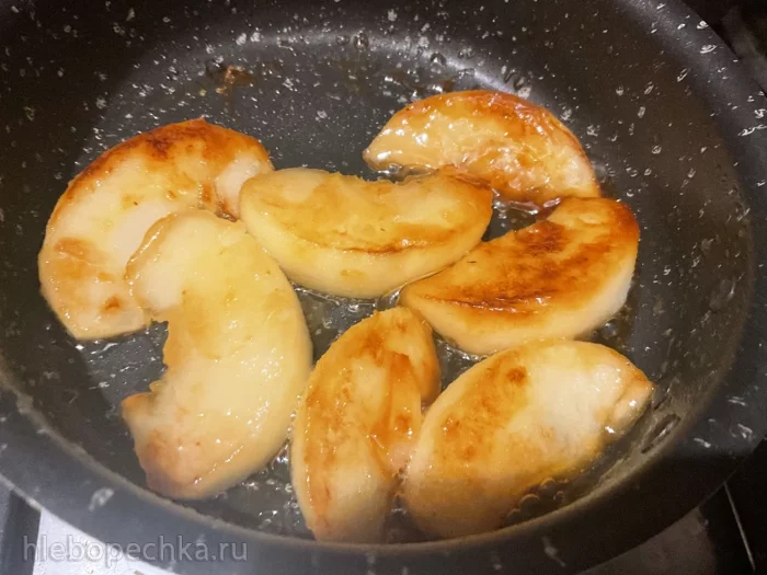 Карамелизировать на небольшой сковородке до золотистого цвета на сливочном масле с добавлением меда (сахара, коричневого сахара). Прикрыть крышкой, чтобы не остыли.
