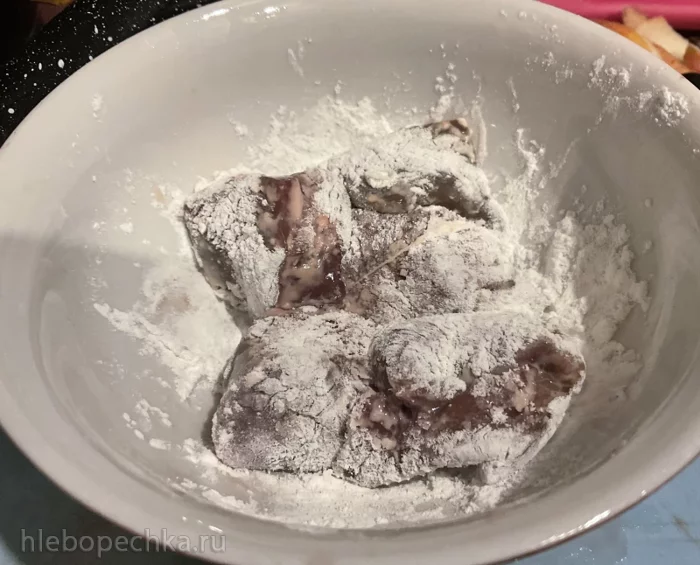 Печень нарезать небольшими кусочками, хорошо промыть, обсушить, обвалять в крахмале