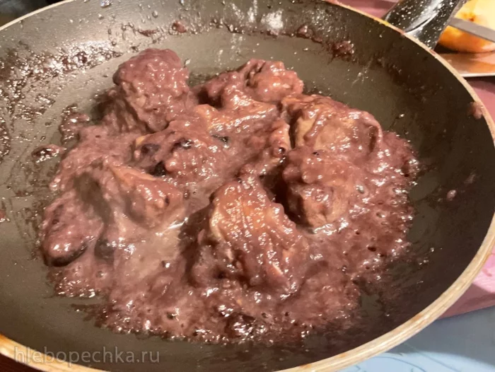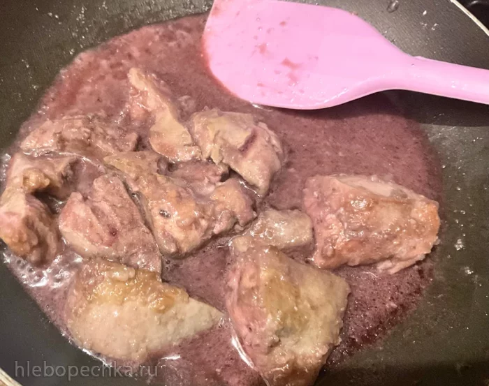 Печень чуть присолить, совсем немного, и, продолжая обжаривать, долить в сковороду вино, добавить для цвета ложку смородинового варенья.