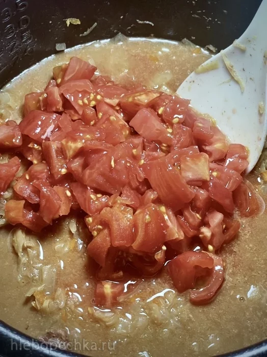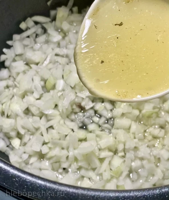 А начал с того, что выставил на мультиварке режим «Тушение». Время – 30 минут. Порубил луковицу. Кубиками меньше среднего размера. И в чашу мультиварки отправил. Налил с полстакана бульона (жир снял, в основном, сверху). Залил им лук.