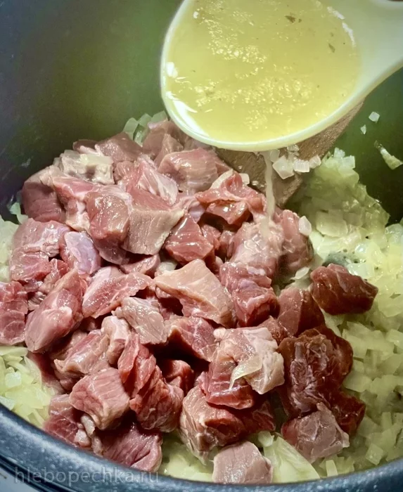 Мякоть говядины нарезал порционными кусочками. И в чашу их отправил, сдобрив стаканом бульона.