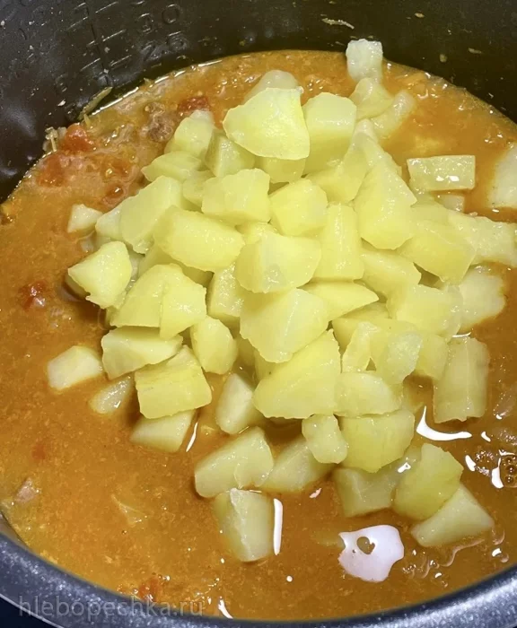 Картошку варил отдельно. В бульоне, но в «своей», т. е. в «её» кастрюльке. И перед финальной частью процесса, после того как приварок бульоном залил, картошку в чашу тоже отправил.