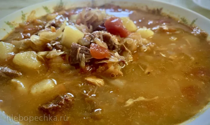 Капуста не сварилась, а именно протомилась, впитав в себя ..., вернее будет сказать, что в приварке вкусы и ароматы продуктов в него вложенных, что называется «переженились». Сочно и смачно так получилось, что и варить то дальше не надо – бери ложку, кусок ржаного хлеба и ..., но не стоит торопить события.