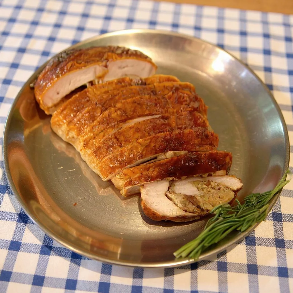 - Слегка прикрываю индейку фольгой и даю ей отдохнуть при комнатной температуре 15 минут. Нарезаю ломтиками толщиной 1.25 см и подаю тёплой с дополнительной начинкой.