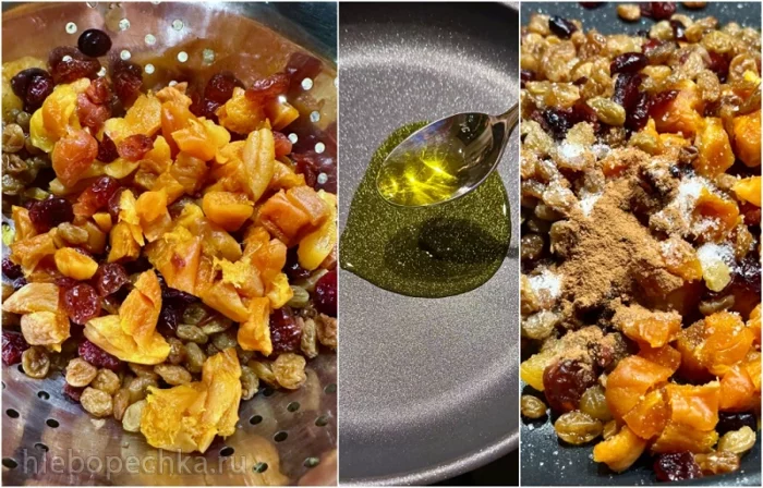 Пару ложек оливкового масла разогрел на сковороде. Именно разогрел, а не раскалил. И отправил туда сухофрукты, ванильный сахар и корицу. Постоянно помешивая на среднем нагреве немного, нет не прижарил, а прогрел хорошо содержимое. Чтобы сахар, корица и фрукты переженились и составили ароматный, сладкий ансамбль.