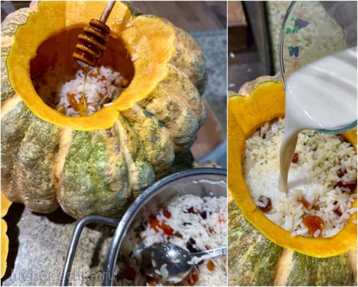 Начинку перекладывал в жабу слоями. Примерно так: пять ложек фруктово-рисовой смеси. Чайную ложку мёда поверх. Распределяя по все поверхности начинки.