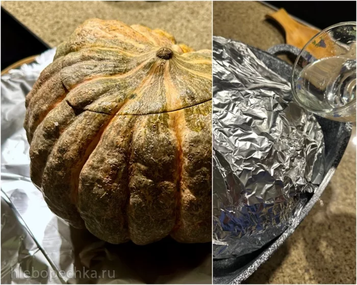 Верхушку жабы на место уложил. Обернул ягодку в несколько слоев фольги. Уложил в большой сотейник и налил стакан воды.