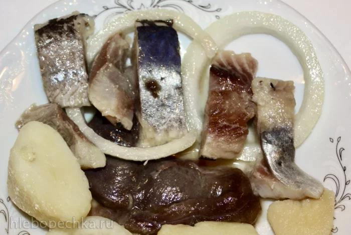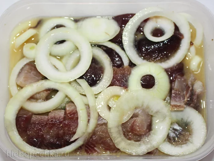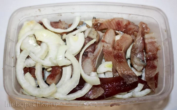 А потом, селёдочку, уложенную в лоток и лучком переслоенную это смесью залить.