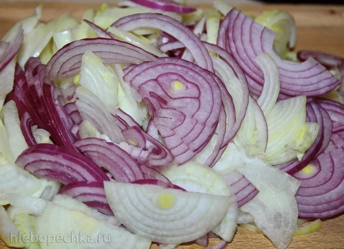 Лук порезал полуколечками, очень постарался тоненько. А потом его распотрошил. Мять не надо.