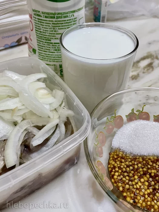 На три селедки, а они у нас был достаточно крупные, йогурта я взял поллитра. Сахара – три столовые ложки. Горчицы тоже – три столовые ложки.